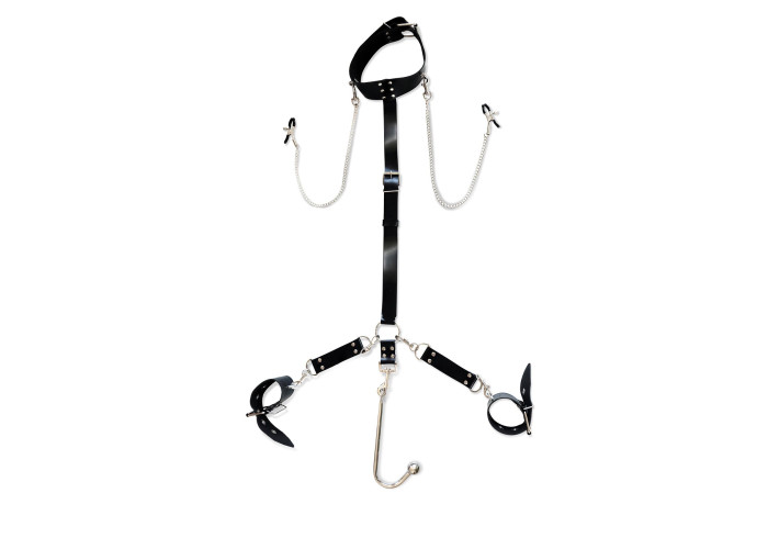 Цей девайс — для гарячих БДСМ-практик для тих, хто не знає меж в отриманні задоволення. Поєднання натуральної шкіри й міцного, гладенького металу — неймовірний фетиш, який сколихне вашу підсвідомість і проявить найтемніші сексуальні бажання. Шкіряний нашийник з наручниками, металевий анальний гак і затискачі для сосків — це не просто звичайна гра з елементами домінування та підкорення. Це девайс, який змусить вашого партнера/партнерку забути про все й лише відчувати біль та задоволення кожною клітиною тіла.