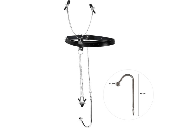 Анальний крюк, виготовлений із безпечного для тіла та гладкого металу, дозволяє вам відкривати нові грані сексуального задоволення і відчуттів. Затискачі для сосків і статевих губ, об’єднані між собою металевим ланцюжком і мають механізми для регуляції сили стистення, щоб змінювати відчуття в залежності від особостих вподобань. Регульовані ремені пояса забезпечують ідеальну посадку та комфорт використання.