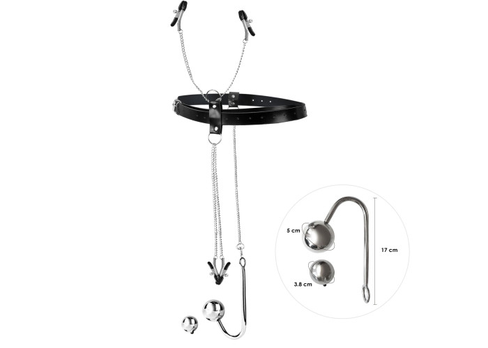 Анальний крюк, виготовлений із безпечного для тіла та гладкого металу, дозволяє вам відкривати нові грані сексуального задоволення і відчуттів. Затискачі для сосків і статевих губ, об’єднані між собою металевим ланцюжком і мають механізми для регуляції сили стистення, щоб змінювати відчуття в залежності від особостих вподобань. Регульовані ремені пояса забезпечують ідеальну посадку та комфорт використання.