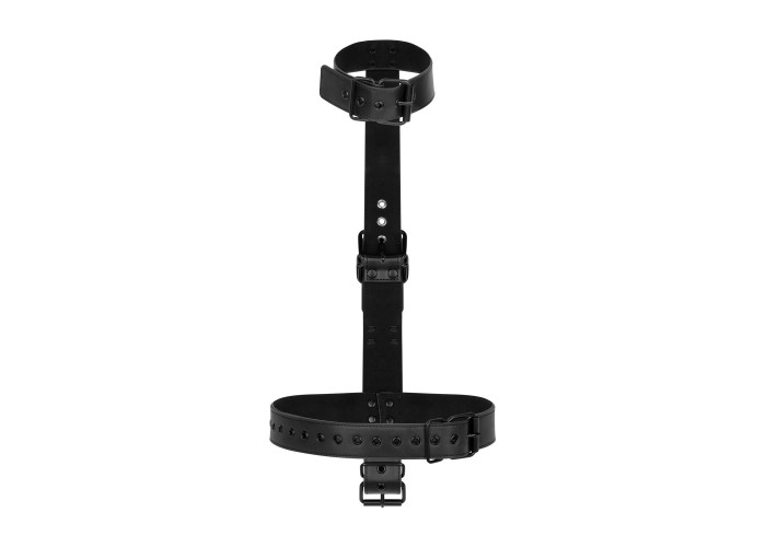 Комплект виконаний з веган-френдлі матеріалу — м’якої штучної шкіри. Широкі ремені посилені кобурними гвинтами. Люверси та пряжки з чорного металу мають стильний та естетичний вигляд. Нашийник і пояс з’єднані між собою широким стрепом, на якому, зі свого боку, розташовані ремені для фіксування зап’ясть, наче наручниками. Одягати фіксатор можна двома способами: щоб руки були закріплені спереду або заведені назад. Обидва способи однаково дієві. Але, можливо, ви придумаєте інше застосування цьому фіксатору?