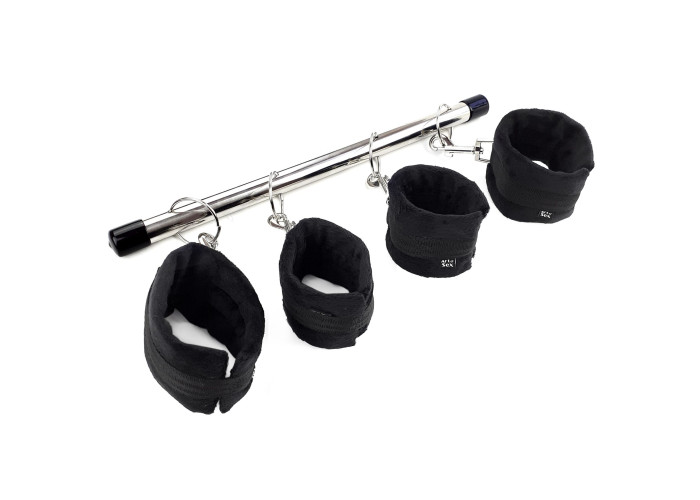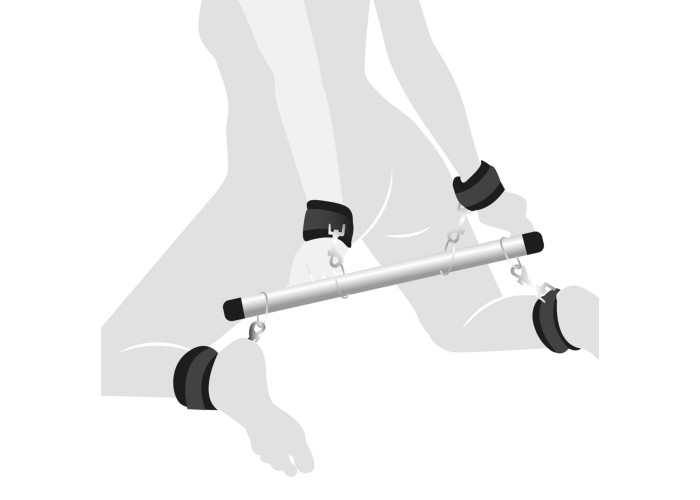 Колодка-розпірка являє собою металеву трубу з кріпленнями-кільцями, до яких за допомогою карабінів можна пристебнути наручники та поножі. У наборі ці аксесуари також є. Вони виконані з м’якого велюру, дуже добре сидять на зап’ястях та щиколотках. Фіксуються і затягуються наручники та поножі липучками. Фантазуйте, кріпіть аксесуари в різному порядку, щоб в буквальному сенсі розкриватися з найнесподіваніших сторін. А якісна металева фурнітура не дасть вирватися на свободу, щоб обидва учасники процесу сповна насолодилися грою.