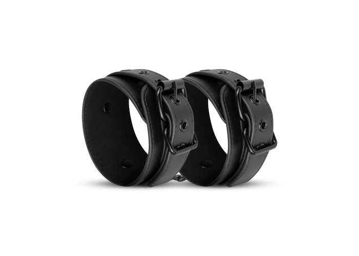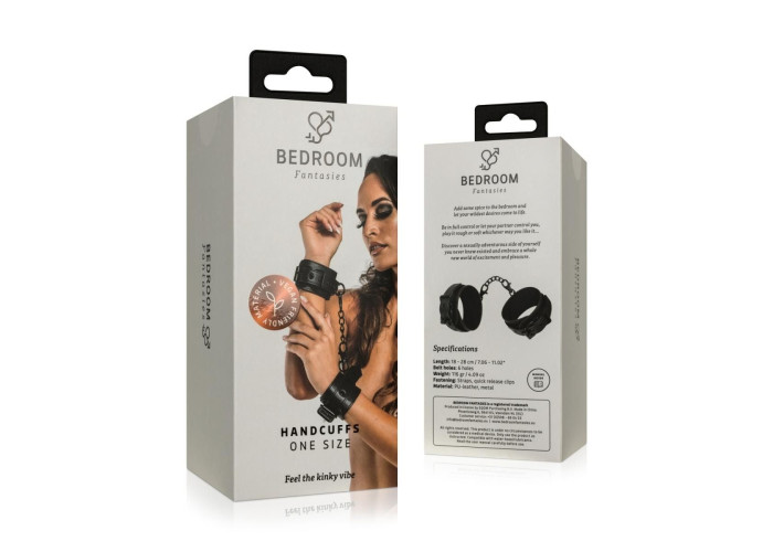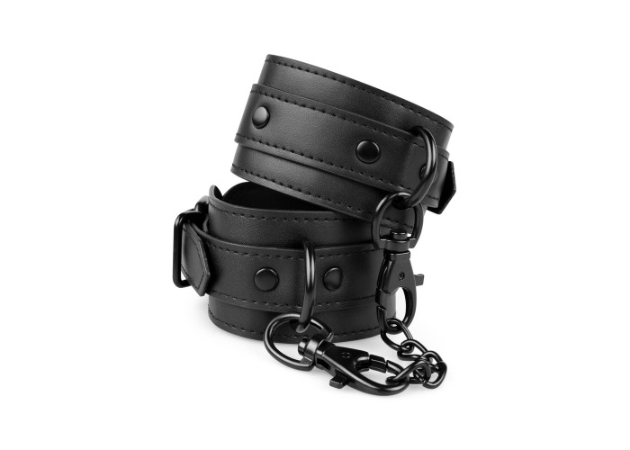 Виготовлені з веган-френдлі матеріалу, наручники м’яко лягають на зап’ястя, не передавлюючи їх. Ремені, посилені кобурними гвинтами, надійно фіксують руки. Ланцюг між наручниками можна від’єднати — на кінцях є карабіни. Чорна фурнітура та нитки мають дуже стильний вигляд.