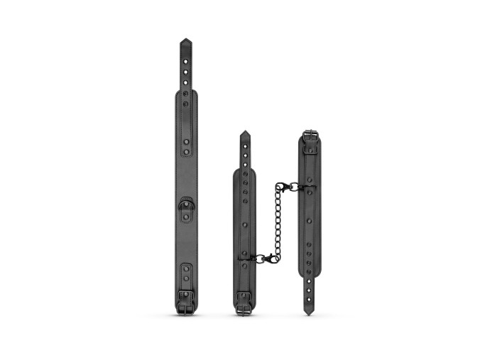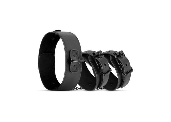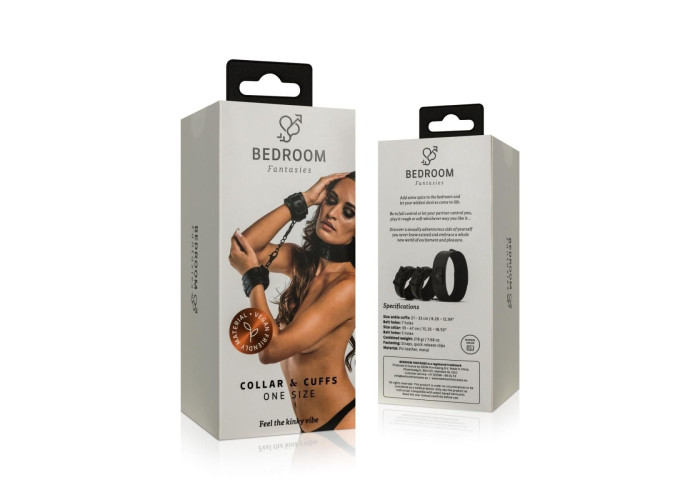 Наручники з нашийником Bedroom Fantasies Collar & Wrist Cuffs виготовлені з веган-френдлі матеріалу. Уся металева фурнітура в чорному кольорі має дуже стильний вигляд зі штучною шкірою. Але крім естетичного задоволення, нашийник та наручники несуть функціональність: силу фіксування аксесуарів на шиї та зап’ястях можна регулювати. Знімні ланцюжки можна прикріплювати між наручниками, наручниками та нашийником, або їх можна зовсім відстебнути. Кільце на нашийнику передбачає, що до нього під час сесії можна прикріпити інші аксесуари.