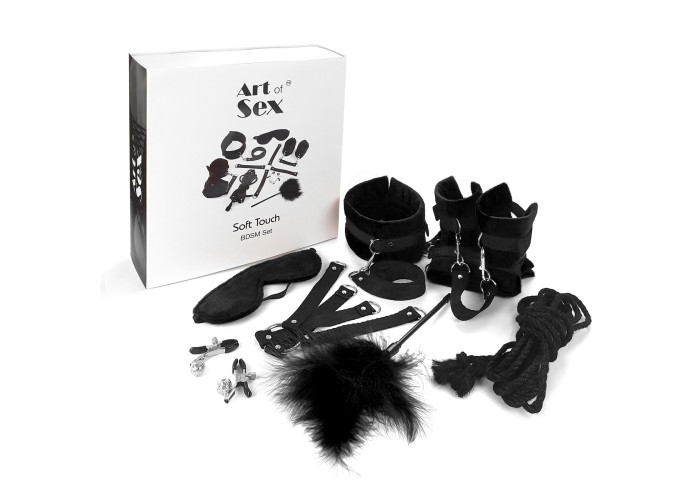 У BDSM-наборі Art of Sex – Soft Touch BDSM Set є: наручники, поножі, затискачі для сосків, лоскітка, маска, мотузка 4 м, хрестовина, нашийник, повідець.
