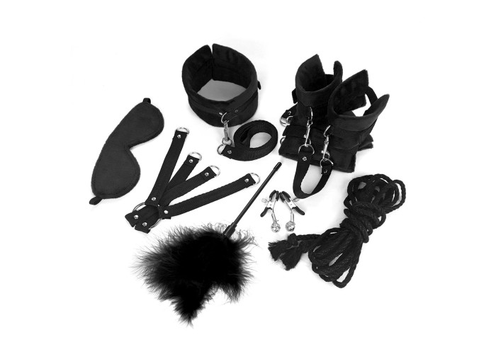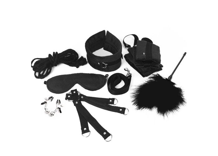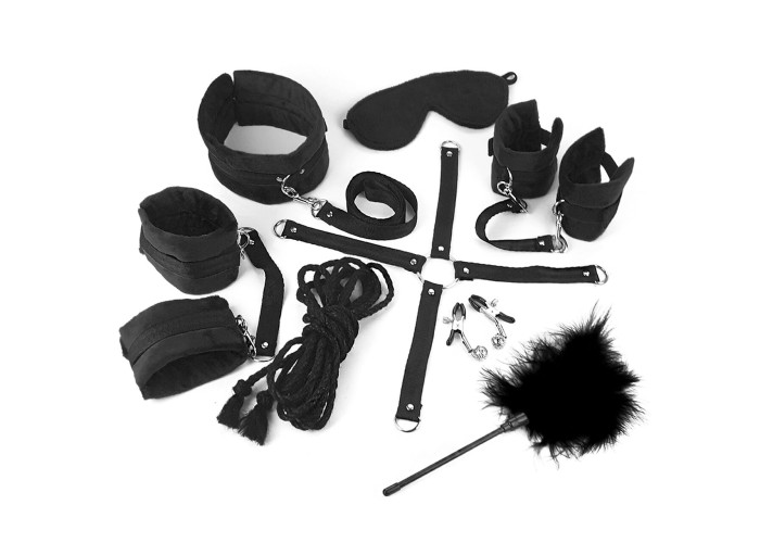 BDSM-набір із 9 предметів Bondage Set Soft touch — повноцінний набір для БДСМ-сесії. Широкі наручники та поножі, а також нашийник та маска виконані з м’якого чорного велюру, який ніжно лягає на шкіру, за правильного використання не натираючи та не завдаючи дискомфорту. Міцна чорна стропа та металеві заклепки доповнюють аксесуари. Зі стропи також зроблені конектори з карабінами, хрестовина та повідець. Висока міцність матеріалу гарантує надійну фіксацію партнера. У наборі також є джутова мотузка, затискачі для сосків та лоскітка. Аксесуари дуже добре комбінуються і можуть стати основою для багатьох сценаріїв, варто лише увімкнути фантазію.