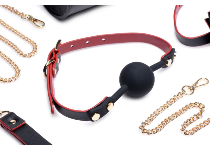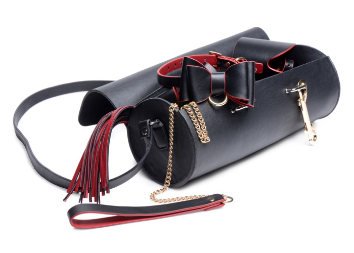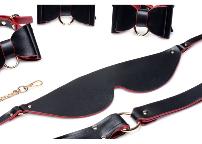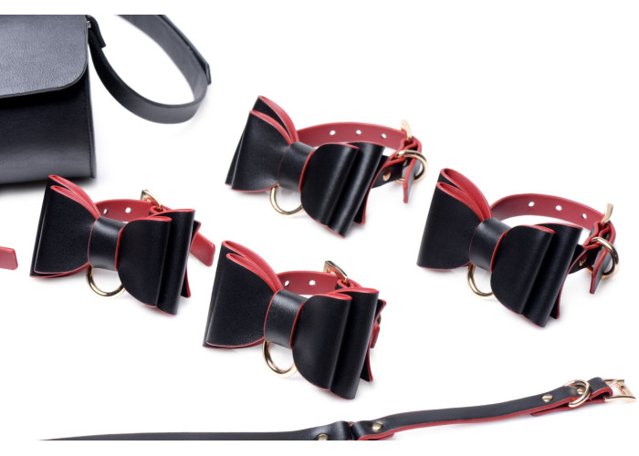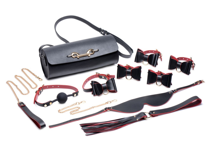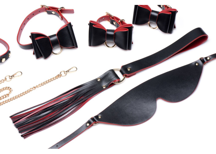 Розкішний набір аксесуарів підійде як новачкам, так і давнім поціновувачам БДСМ-сесій. Усі аксесуари набору зроблені з веган-френдлі штучної шкіри чорного та червоного кольорів. Уся фурнітура представлена в золотистому кольорі з металу, що не містить нікель. Чорні зовні наручники, поножі та чокер усередині виконані в червоному кольорі та прикрашені об’ємними подвійними бантами зі штучної шкіри. Ремені легко регулюються до потрібного обсягу. Кільця під бантами припускають, що до них можна прикріпити додаткові аксесуари — ланцюжки, повідці, хрестовини та ін. Силіконовий кляп-кулька кріпиться до міцних чорно-червоних ременів заклепками. Ремені можна регулювати під розмір голови. Зручна маска на очі також регулюється ременями. Флогер із петлею-ручкою зручно лягає в руку й компактно складається завдяки кільцю між петлею та хвостами. Повідець із петлі та довгого ланцюжка можна застосувати в будь-якій комбінації з іншими аксесуарами. Він також може стати предметом покарання неслухняного сабмісиву. Стильна сумочка для зберігання та перевезення аксесуарів виконана із чорної штучної шкіри. Ремінь сумки можна відрегулювати за довжиною. Застібку у вигляді подвійного карабіна можна також використовувати у своїх вигадливих іграх.