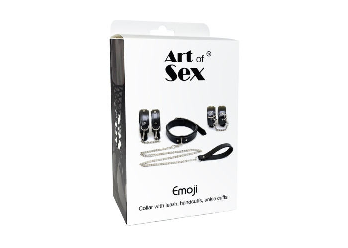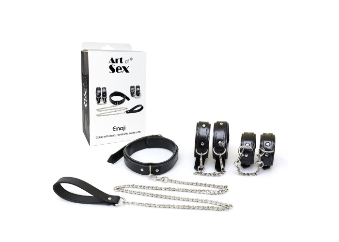 Оригінальний набір з трьох елементів Art of Sex - Emoji: нашийника з повідцем, наручників і поножів призначений для тих, хто бажає розширити свій досвід в інтимних відносинах та відчути неймовірну суміш влади, пристрасті та пригод. Всі елементи набору виготовлені з високоякісних матеріалів. Наручники та поножі забезпечують м'яку підтримку і комфортне прилягання до зап'ясть та щиколоток. Нашийник з металевим повідцем надійно фіксується на шиї і дозволяє керувати рухами партнера. Регульовані затягувальні ремені дозволяють вам налаштовувати ступінь фіксації для комфортного носіння протягом всієї гри.