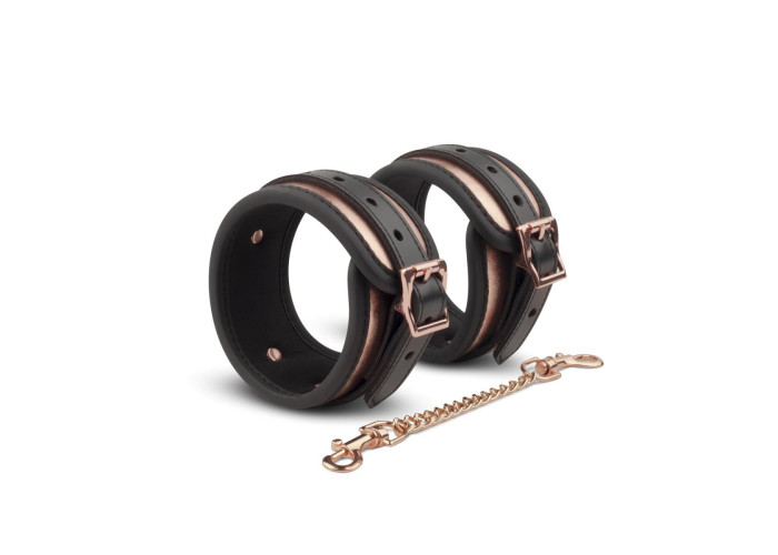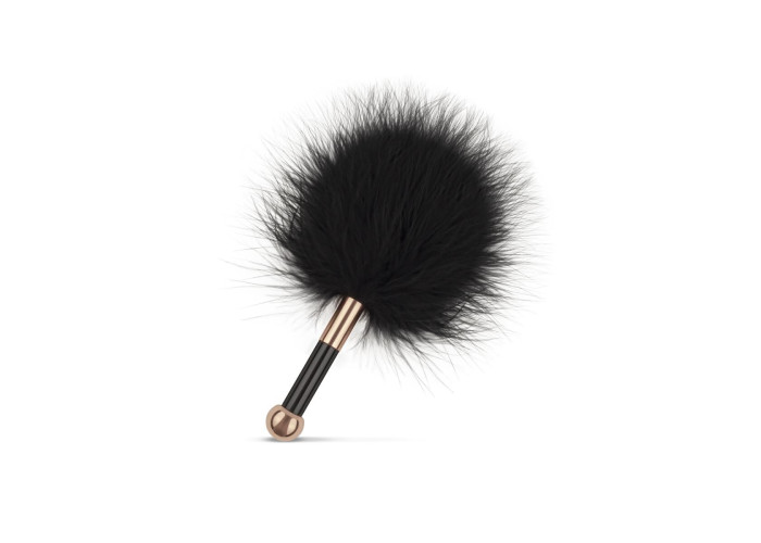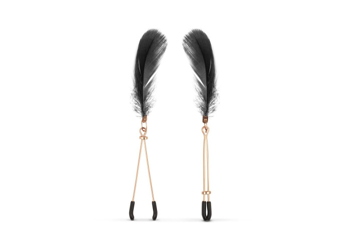 Набір виконаний зі штучної шкіри та фурнітури чорного та кольору рожевого золота. Це незвичне поєднання додає розкоші кожному аксесуару. М’які широкі наручники та поножі чудово фіксують зап’ястя та щиколотки, водночас не травмуючи їх. Ланцюжки з карабінами дають змогу з’єднати між собою аксесуари або приєднати їх до інших предметів — ліжка, хрестовини тощо. Тонкий стильний нашийник має дуже привабливий вигляд на ніжній шиї. Довгий повідець-ланцюг кріпиться до кільця на нашийнику. Металеві затискачі на соски захищені м’якими наконечниками, щоб не пошкодити ніжну шкіру грудей. Силу стиснення можна регулювати повзунком. Прикрашені затискачі чорними пір’їнками. Довга шльопалка і м’яка коротка лоскоталка можуть взаємовиключати один одного, а можуть працювати в парі: почергове ніжне погладжування і відчутне шльопання прикутого партнера можуть викликати бурю збудження. Закрийте коханому очі широкою атласною стрічкою — і сміливо проводьте чуттєві експерименти над його тілом, що прагне пестощів та покарань. Додайте до солодкої тортури крапельки воску зі свічки, яка тане за мінімальних температур, і ви отримаєте неймовірний набір, експериментувати з яким можна практично нескінченно.