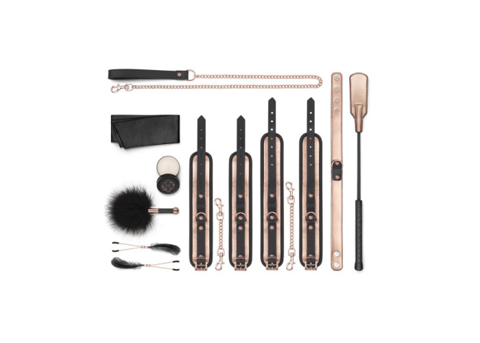 У наборі є: наручники, фіксатори для ніг, нашийник, повідець, затискачі на соски, стрічка, лоскоталка, шльопалка, масажна свічка.