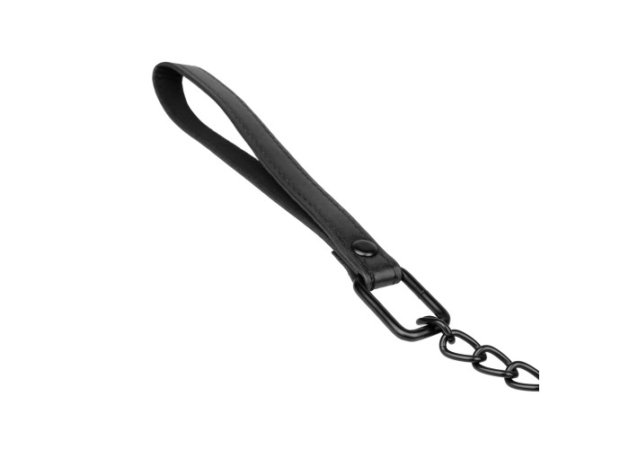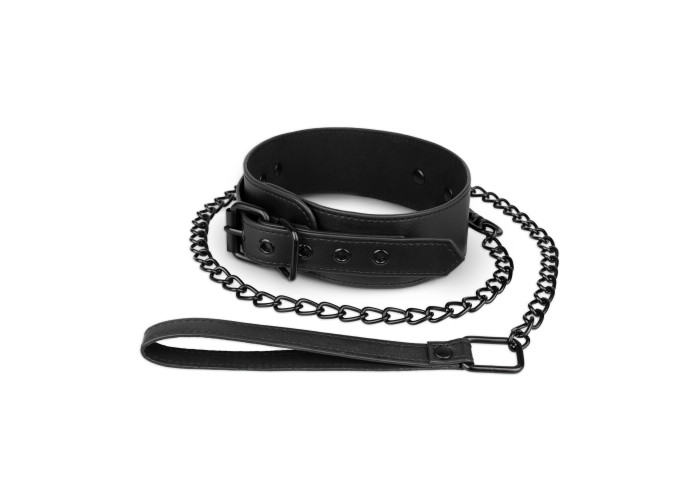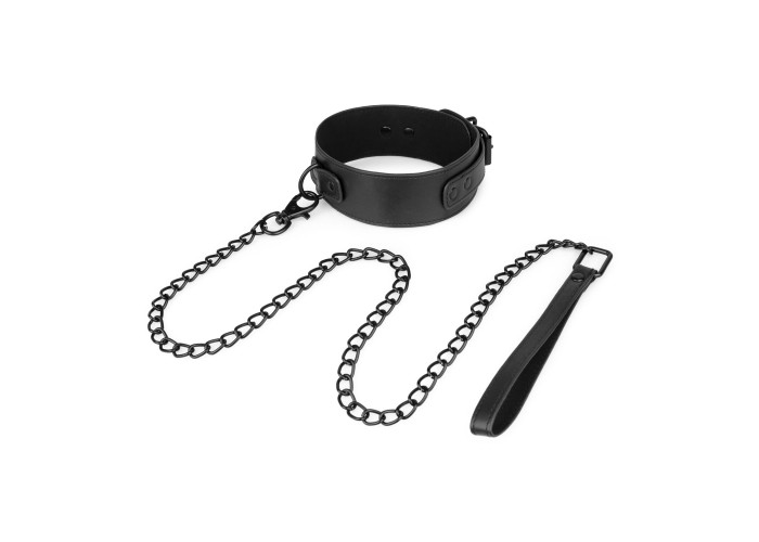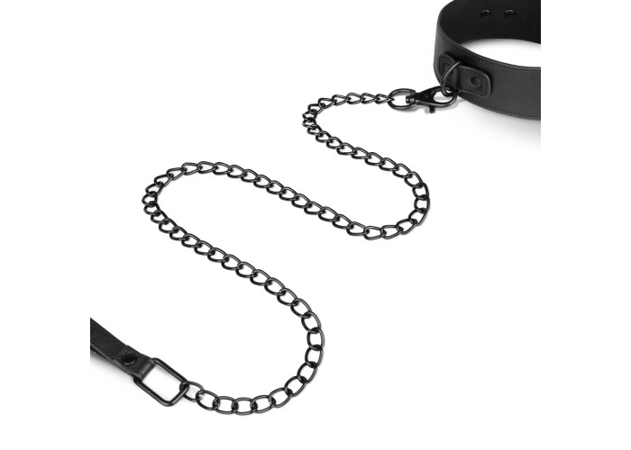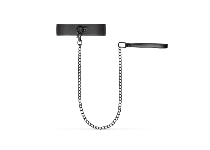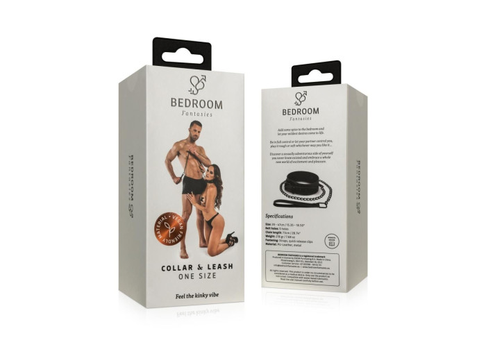 Нашийник з повідцем Bedroom Fantasies Faux Leather Collar & Chain виготовлений із веган-френдлі матеріалу. Уся металева фурнітура в чорному кольорі має дуже стильний вигляд зі штучною шкірою. Але крім естетичного задоволення, нашийник несе функціональність: силу фіксування аксесуарів на шиї можна регулювати. До кільця на нашийнику під час сесії можна прикріпити довгий повідець з ланцюга. На кінці повідця є петля зі штучної шкіри для фіксації на зап’ясті.