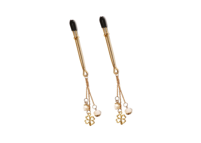 Затискачі для сосків Art of Sex - Nipple Clamps Golden Clover – це елегантний інтимний аксесуар, який поєднує в собі розкішний дизайн та високу функціональність. Виготовлені із високоякісного металу, ці затискачі не тільки мають вишуканий вигляд, але і є стійкими до корозії та гіпоалергенними для безпечного використання на тілі. Затискачі прикрашені підвісками у вигляді золотих листочків клевера, що робить їх дизайн більш ніжним та вишуканим.