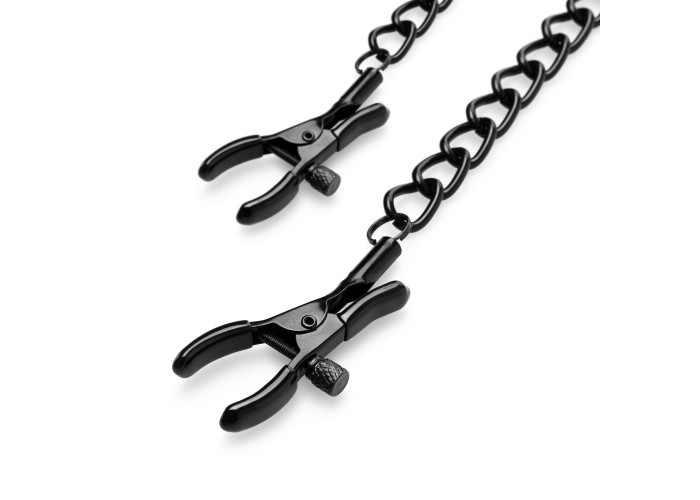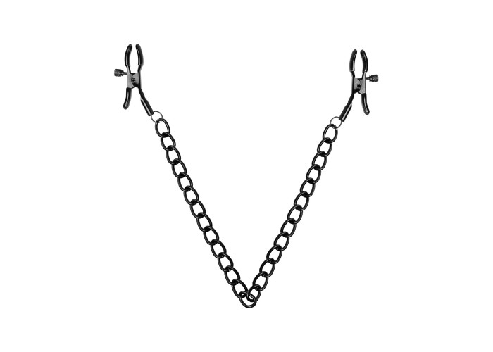Щоб додати пікантності до інтимної гри, рекомендуємо купити затискачі для сосків Bedroom Fantasies Nipple Clamps with Chain. Сила тискання затискачів регулюється гвинтами, кінчики затискачів закриті м’якими ковпачками, щоб не пошкодити ніжну шкіру сосків. Чорний металевий ланцюжок із великих ланок між затискачами додає стиль та чуттєвість.