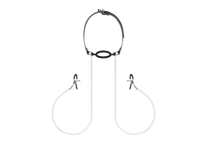 Силіконове кільце-кляп достатньо великого діаметра — 5 сантиметрів. Його можна використовувати і як кляп, затиснувши між зубами півколо, і як розширювач для рота — звичайно, якщо це не завдасть сильного дискомфорту партнеру. Широкі ремені для голови виконані з м’якого веган-френдлі шкірозамінника. Вони легко регулюються практично на будь-який обсяг голови завдяки великій кількості отворів. Затискачі для сосків регулюються гвинтами. Кінці затискачів закриті м’якими ковпачками, щоб захистити ніжну шкіру від пошкоджень. Затискачі для сосків з’єднані з кляпом двома сріблястими ланцюжками з невеликих ланок. Достатньо довгі ланцюжки дають змогу вільно рухатися, не відчуваючи дискомфортного натяжіння.