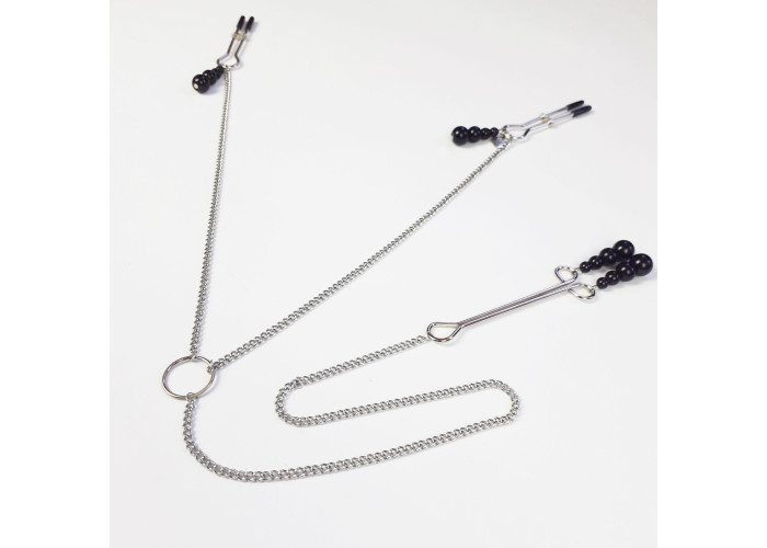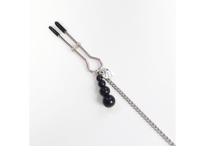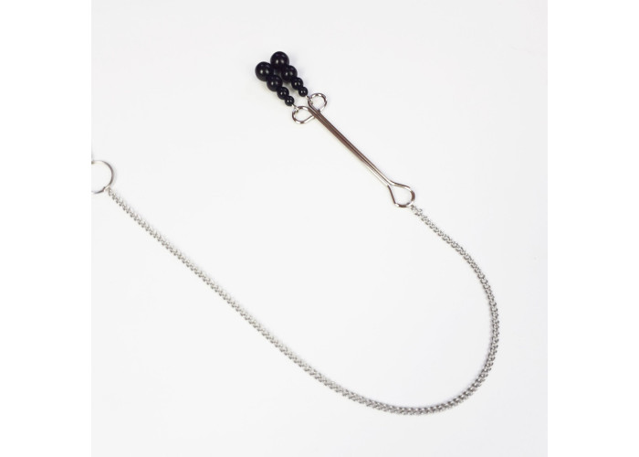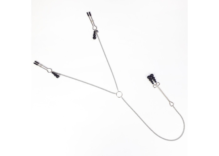 Так, в інтимних прикрасах теж є свої тенденції та модні віяння. Затискачі з'єднані між собою тонким металевим ланцюжком і прикрашені чорними перлинами. Безпечну експлуатацію забезпечують м'які силіконові накладки.