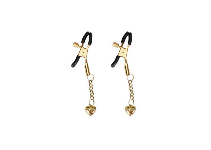 Затискачі виготовлені з високоякісного золотистого металу і прикрашені підвіскою у вигляді сердечка. Робочі поверхні мають м’які гумові накладки, які пом’якшують тиск на соски та забезпечують комфортну стимуляцію без болю.