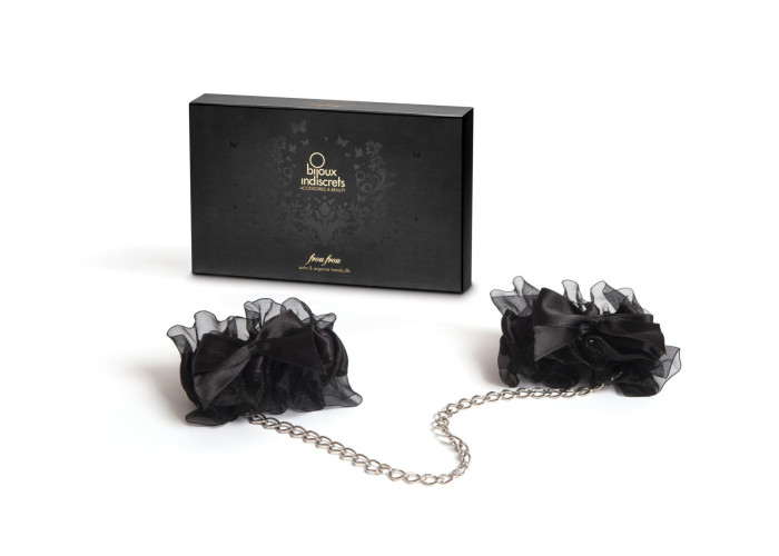 Пропонуємо придбати наручники Bijoux Indescrets - Frou Frou organza handcuffs, витончений аксесуар з атласу і органзи з металевим ланцюжком. Вони доставлять як естетичне задоволення своїм спокусливим зовнішнім виглядом, так і тактильне, завдяки ніжному дотику атласу і органзи. У браслети вшита пласка гумка.