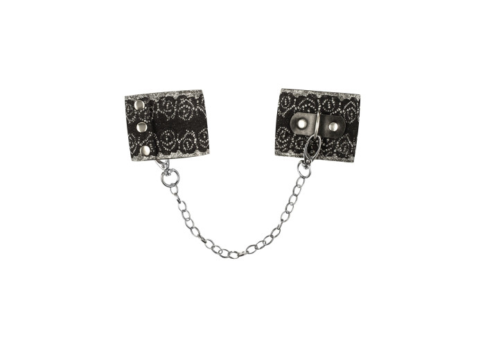 Наручники виконані з м’якого матеріалу, який комфортно та дбайливо відчувається на руках. Чорний широкий матеріал вигадливо розфарбований срібними блискітками. Застібаються наручники за три кнопки. Невеликий ланцюг кріпиться карабінами, за бажання його можна прибрати.