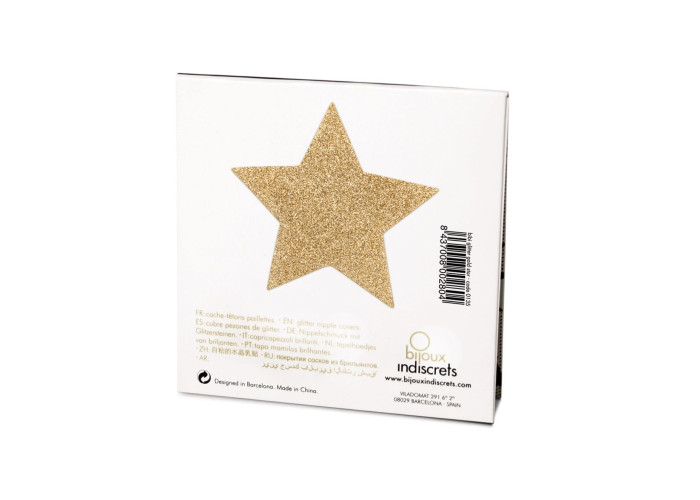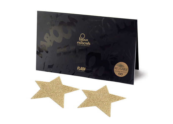 Прикрасьте свої груди ефектними пестісамі Bijoux Indiscrets Flash Star у формі зірки. Аксесуари виконані з красивого, м'якого матеріалу золотавого кольору, покритого безліччю блискіток. Прикраси для грудей кріпляться до тіла за допомогою самоклеючої силіконової основи, що робить їх неймовірно зручними у використанні. Багаторазові - просто клеїти і також просто знімати. Перетворіть себе в спокусу, перед якою не втримається жоден чоловік.