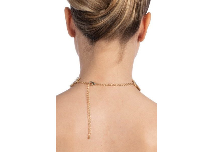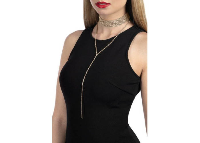 По всій довжині кольє прикрашено стразами теплого золотого відтінку, що робить його особливо ошатним. Незвичайне поєднання чокер плюс підвіс підкреслить індивідуальність і зробить образ завершеним.