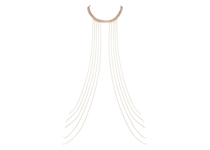 Подивіться на цей ніжний витончений аксесуар. Він створений для того, щоб показати вашу вишуканість і елегантність. Десять тонких золотистих ланцюжків з маленьких круглих ланок кріпляться на широкому золотистому чокері й спускаються до стегон красивим золотим каскадом, привертаючи увагу до фігури. На спинці безліч ланцюжків з'єднуються у два й кріпляться до чокера ззаду.