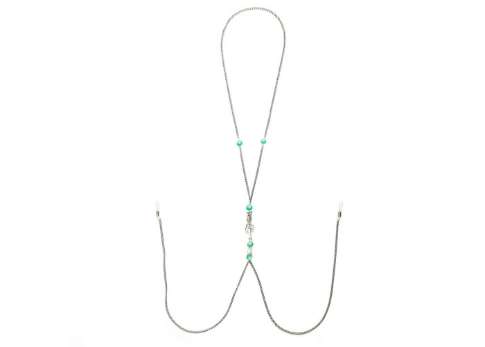 Спокуслива прикраса для сосків покликана притягувати погляд до плавних ліній жіночої шиї, ключиці та грудей. Металева прикраса обрамляє шию, спускаючись на груди та кріплячись на сосках за допомогою силіконових фіксаторів. Декоративні намистини та підвіска – стріла додають прикрасі шарму, роблячи її основним акцентом на жіночому тілі.