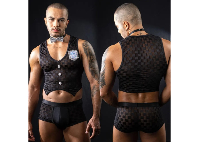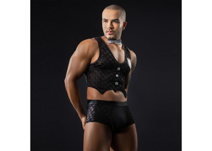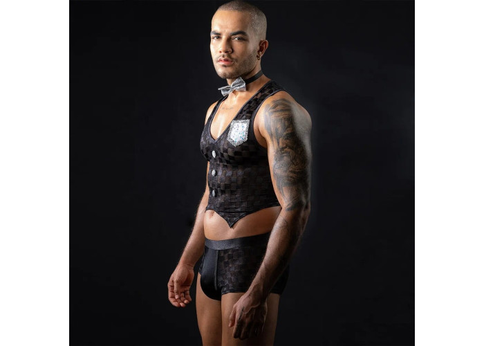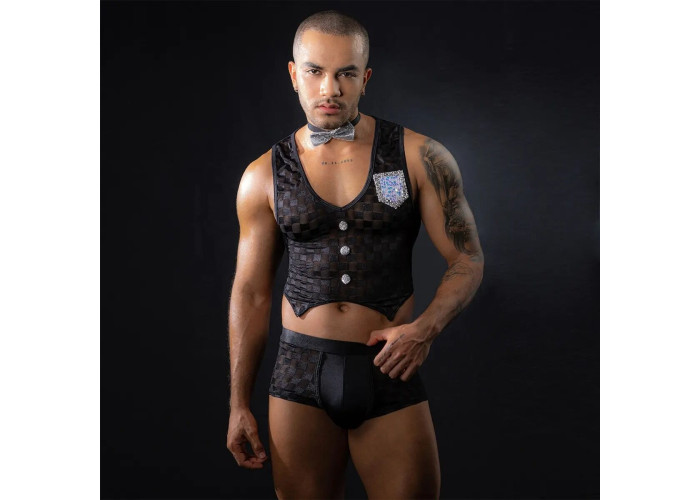 Цей симпатичний хлопець готовий запропонувати вам гаряче меню та солодкі десерти, варто вам поманити його пальчиком. Рекомендуємо купити чоловічий еротичний костюм офіціанта «Привабливий Михаель», щоб скоріше зробити своє вишукане замовлення. Топ зовні має вигляд як жилет дорогого костюма. Він щільно облягає фігуру, гарно оголюючи груди та живіт. Труси-боксери підкреслюють попку та стегна. Симпатична срібляста краватка-метелик на кнопці додає костюму елегантності.