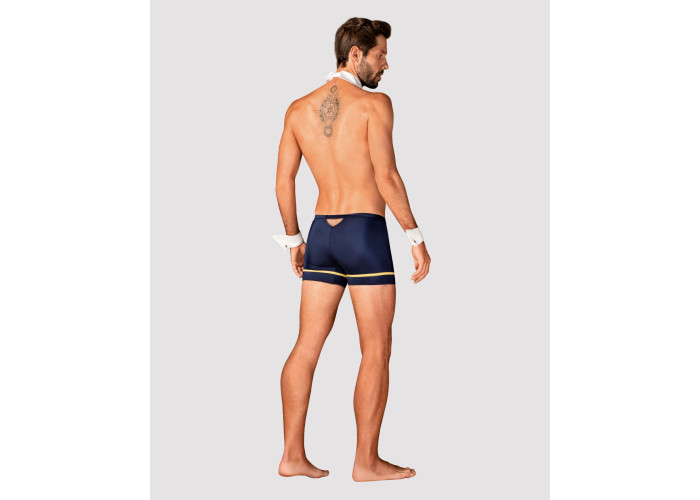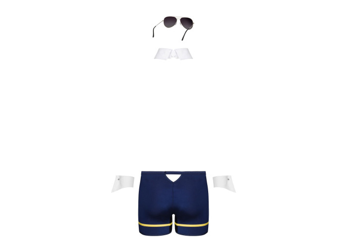 Еротичний костюм пілота з окулярами Obsessive Pilotman set виготовлений із м’якого, приємного до тіла еластичного матеріалу. Боксери красиво лягають на стегна, підкреслюючи сідниці та інтимні місця. Синій матеріал із золотою обробкою та схожим на крила логотипом нагадують про романтику польотів, а виріз ззаду інтригує та задає еротичний тон. Комір з краваткою та манжети додають особливість образу. Комір для зручності застібається на гудзики, манжети — на кнопки. Стильні окуляри завершують образ сміливого пілота.