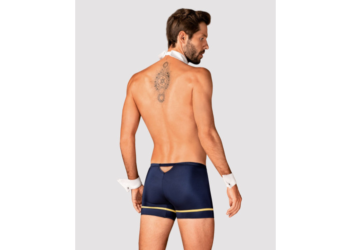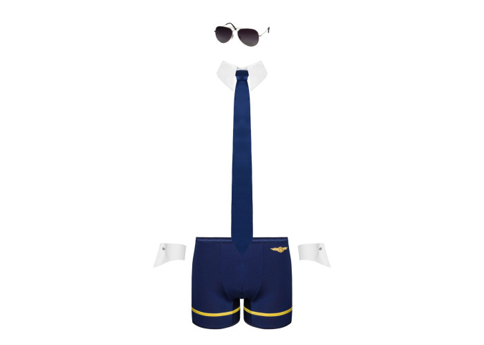 Еротичний костюм пілота з окулярами Obsessive Pilotman set виготовлений із м’якого, приємного до тіла еластичного матеріалу. Боксери красиво лягають на стегна, підкреслюючи сідниці та інтимні місця. Синій матеріал із золотою обробкою та схожим на крила логотипом нагадують про романтику польотів, а виріз ззаду інтригує та задає еротичний тон. Комір з краваткою та манжети додають особливість образу. Комір для зручності застібається на гудзики, манжети — на кнопки. Стильні окуляри завершують образ сміливого пілота.