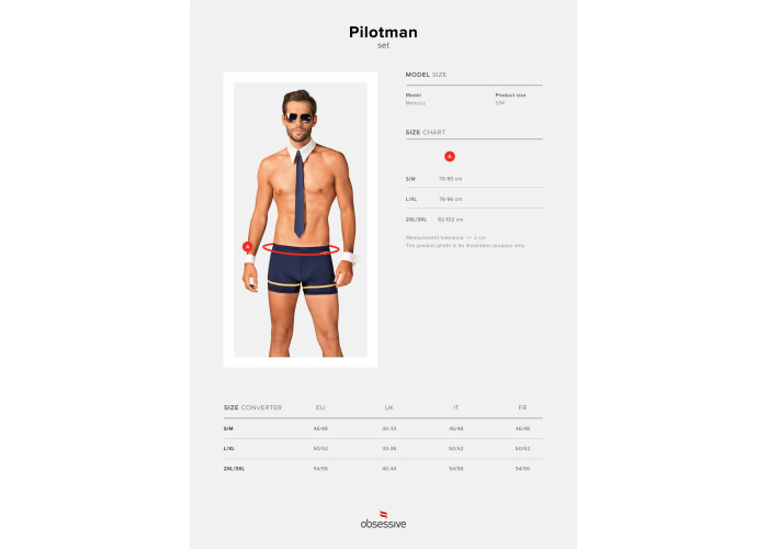 Еротичний костюм пілота з окулярами Obsessive Pilotman set складається з боксерів, манжетів, коміра з краваткою та окулярів.