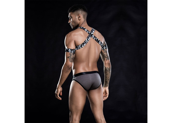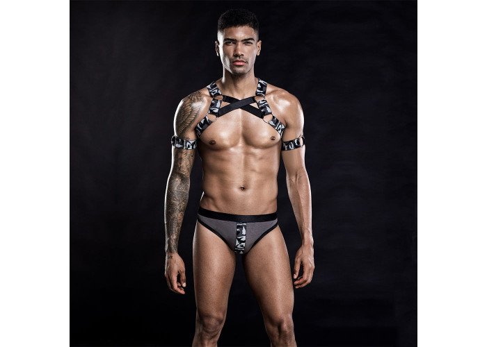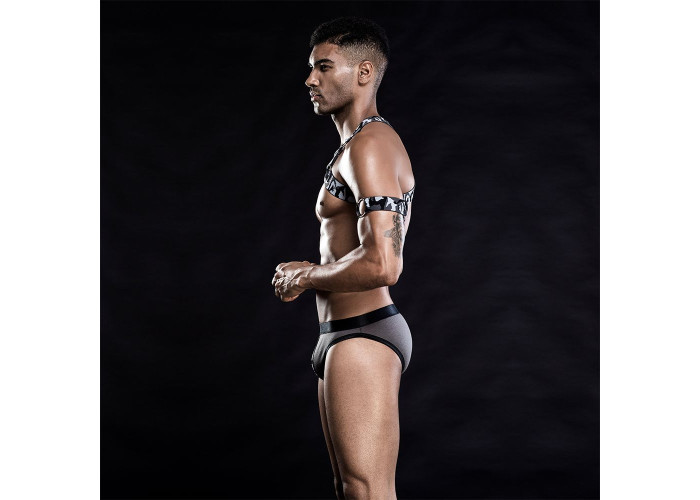 Класичні труси-плавки облягають тіло, підкреслюючи розміри твого бійця за рахунок вертикальної вставки. Додаткова портупея на груди і біцепси створює потужний образ суворого сексуального воїна, який може практично все.