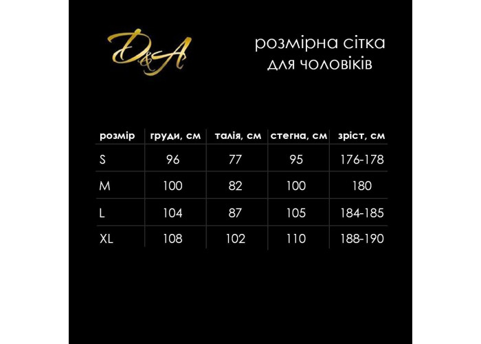 XL, розміри в обхваті: груди — 108 см, талія — 102 см, стегна — 110 см, підходить на зріст 188–190 см.