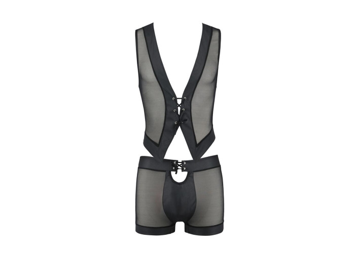 Жилет і труси-шортики пошиті з м’якої міцної сіточки, яка щільно і сексуально обтягує тіло. Планки жилета й пояс боксерів оздоблені широкою смужкою екологічної шкіри, оздобленою люверсами й шнурівкою. Загальний вигляд комплекту нагадує корсет, але повірте: жорсткий і брутальний він тільки на вигляд — на дотик усі деталі м’які та легкі.
