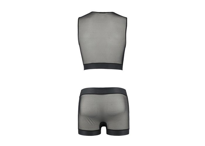 Жилет і труси-шортики пошиті з м’якої міцної сіточки, яка щільно і сексуально обтягує тіло. Планки жилета й пояс боксерів оздоблені широкою смужкою екологічної шкіри, оздобленою люверсами й шнурівкою. Загальний вигляд комплекту нагадує корсет, але повірте: жорсткий і брутальний він тільки на вигляд — на дотик усі деталі м’які та легкі.
