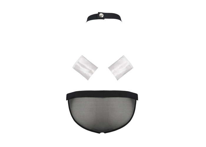 Манжети та комірець-метелик застібаються на кнопки, що дуже зручно під час сексуальної гри. Передня частина трусиків виконана з м’якого тканинного матеріалу, прикрашеного трьома чарівними бантиками, з боків і на сідницях — дрібна м’якенька сіточка.
