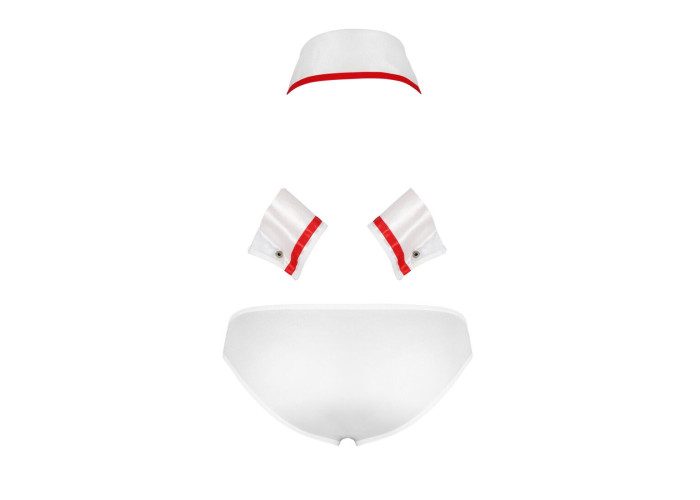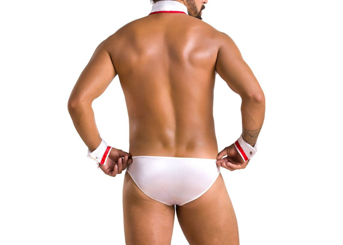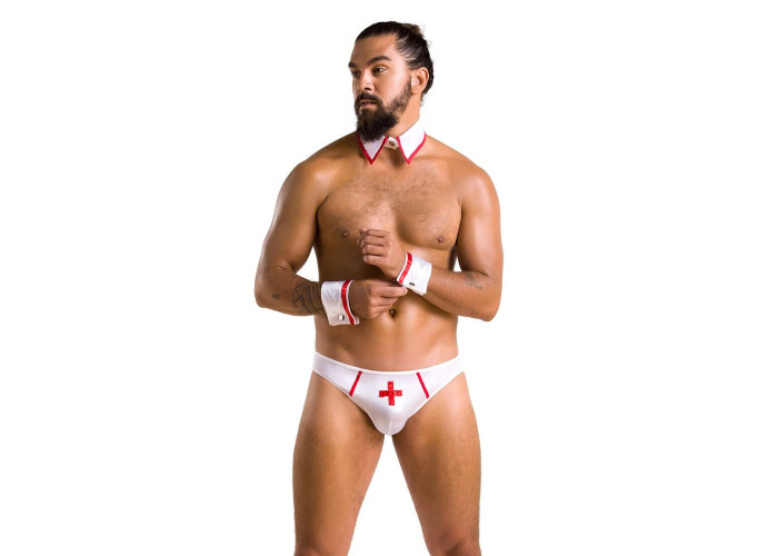 Еротичний костюм медбрата — це те, що потрібно для яскравого й цікавого проведення часу. Білі трусики із заниженою талією пошиті з м’якого матеріалу, який відмінно сидить на сідницях. Манжети й комірець-метелик оздоблені червоною стрічкою, з якої виконано хрест. Кнопки на манжетах і комірці можна швидко розстебнути, щоб у потрібний момент зняти із себе зайве.