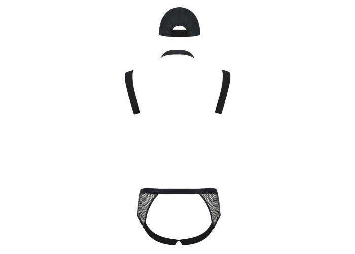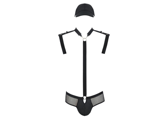 Цей стильний комплект, пошитий з м’якої екошкіри й широких резинок, оцінять прихильники сексуальних ігор і любовних пригод. Трусики-сліпи виконані з екошкіри та сітки, сідниці відкриті. М’якенькі ремені красиво лягають на тіло, підкреслюючи мужність і пристрасність, а псевдопогони та кепка навіюють думки про сильного поліцейського. А ось кнопки, кільця й карабіни нагадують, що сильний поліцейський може бути ще й надзвичайно сексуальним.