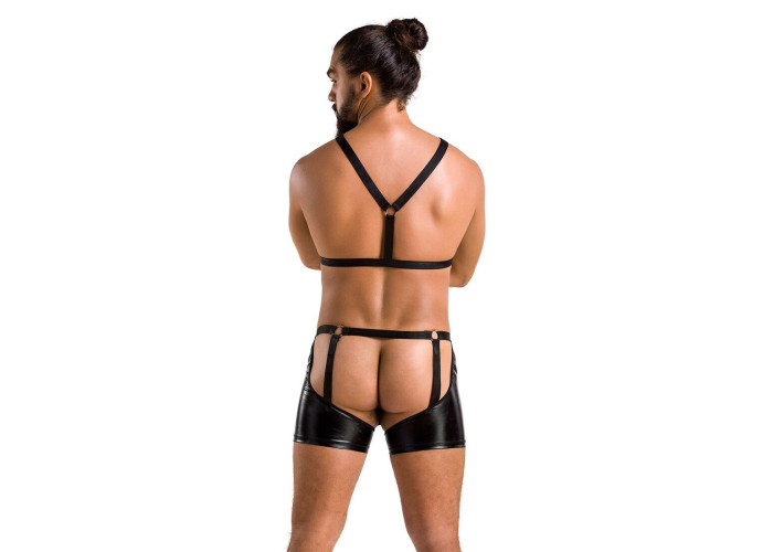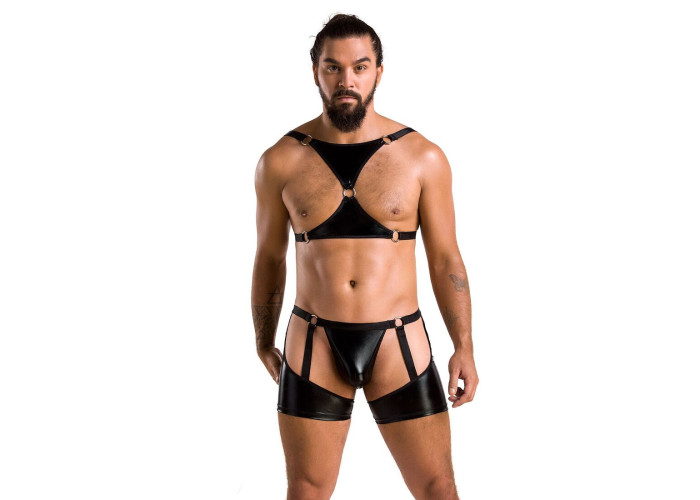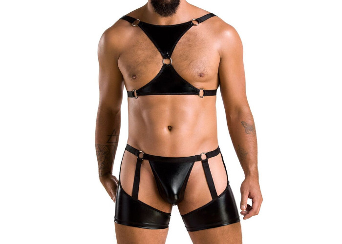Комплект еротичної чоловічої білизни Passion Set John максимально відвертий, зухвалий і привабливий. Він виконаний з м’якої тканини з «мокрим» ефектом, м’якеньких широких еластичних ременів і декорований металевими кільцями. Завдяки блискучому ефекту тканина гарно облягає і підкреслює всі особливості та спокусливі опуклості тіла. Доступ до найпотаємнішого максимально простий, адже генітальна кишеня кріпиться тільки на низькому стегновому поясі. Гартери красиво підкреслюють стегна спереду і ззаду, а відкриті сідниці додають комплекту відвертості. Портупея з комплекту еротичної чоловічої білизни Passion Set John виконана з блискучого матеріалу й м’якеньких резинок. Вона спокусливо лягає на груди, оголюючи соски.
