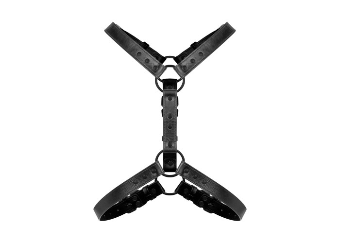 Ремені портупеї виготовлені з м’якої веган-френдлі штучної шкіри. Для міцності кожен загин посилено потрійними заклепками. Стрепи портупеї проходять вертикально між грудьми, роздвоюючись зверху на плечах і знизу по обидві сторони талії. На спині є такий самий вертикальний стреп. Місця стикування ременів позначені кільцями — вони мають доволі стильний вигляд і можуть виконувати ще функцію тримачів: наприклад, повідця. Портупея регулюється під особливості фігури в п’яти точках — на плечах, спині та з боків на талії.