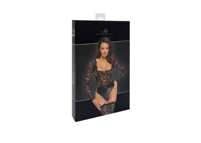 Рекомендуємо вам купити чорне боді Noir Handmade F296 Psyche, що вирізняється незвичайним фасоном і міксом матеріалів. Головний сюрприз моделі — нижня частина з матеріалу wetlook, що імітує латекс. Ця деталь виконана у вигляді трусиків танга із середньою посадкою, високими вирізами й доступом до промежини на блискавці. Верх з довгими рукавами й закритою спиною виконаний з м'якого мережива. Ця особливість дає змогу носити боді як частину вечірнього вбрання, поєднуючи його зі спідницею або штанами й взуттям на підборах.