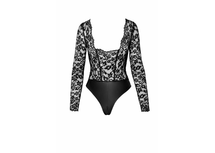 Рекомендуємо вам купити чорне боді Noir Handmade F296 Psyche, що вирізняється незвичайним фасоном і міксом матеріалів. Головний сюрприз моделі — нижня частина з матеріалу wetlook, що імітує латекс. Ця деталь виконана у вигляді трусиків танга із середньою посадкою, високими вирізами й доступом до промежини на блискавці. Верх з довгими рукавами й закритою спиною виконаний з м'якого мережива. Ця особливість дає змогу носити боді як частину вечірнього вбрання, поєднуючи його зі спідницею або штанами й взуттям на підборах.