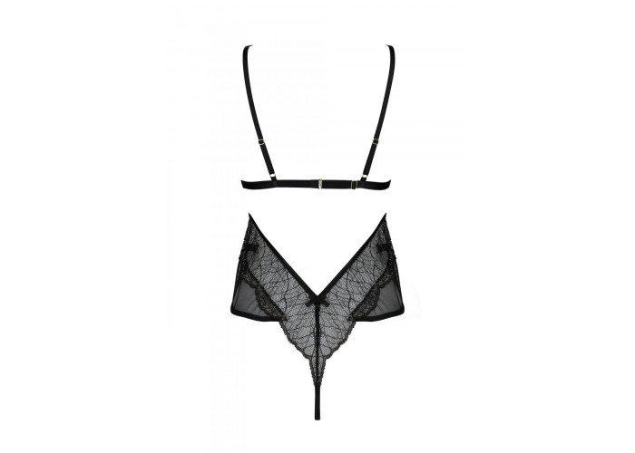 Боді Passion AMBERLY BODY характеризується оригінальним вишуканим кроєм. Трикутні чашечки ліфа з м’якого мереживного полотна підкреслюють природну красу грудей і утворюють чарівне декольте. Ще один ажурний трикутник прикриває верхню частину живота, візуально звужуючи талію завдяки вирізам на боках. Нижня частина з напівпрозорого матеріалу прикриває живіт і стегна, створюючи інтригу в образі. А на сідницях розкіш мережива переходить у тонку смужку стрінгів.