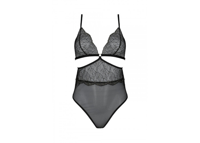 Боді Passion AMBERLY BODY характеризується оригінальним вишуканим кроєм. Трикутні чашечки ліфа з м’якого мереживного полотна підкреслюють природну красу грудей і утворюють чарівне декольте. Ще один ажурний трикутник прикриває верхню частину живота, візуально звужуючи талію завдяки вирізам на боках. Нижня частина з напівпрозорого матеріалу прикриває живіт і стегна, створюючи інтригу в образі. А на сідницях розкіш мережива переходить у тонку смужку стрінгів.
