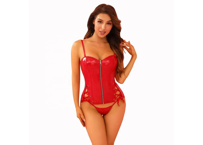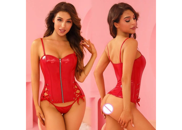 Еластичний матеріал корсета має мокрий ефект, улюблений тусовщицями та завсідниками клубних паті. Тканина щільно облягає тіло, підкреслюючи всі переваги. Ліф корсета пошитий у такий спосіб, що апетитні частини грудей залишаються на виду. Срібляста застібка-блискавка корсета розташовується спереду. Традиційна шнурівка розташована з боків від блискавки: металеві люверси та червоні стрічки мають стильний та сексуальний вигляд. Крім стрічок, регулювати корсет під особливості своєї фігури, можна за допомогою бігунків на лямках ліфа. Маленькі трусики, що йдуть у комплекті з корсетом, лише трохи прикривають лобок і залишають попку відкритою.