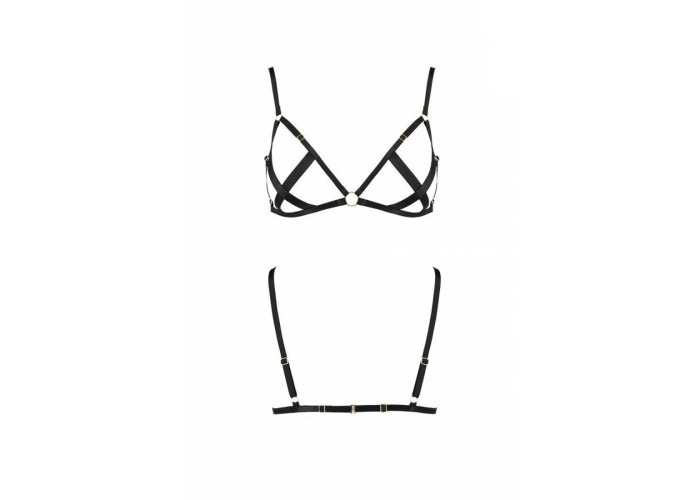 М’які еластичні ремені красиво охоплюють груди, делікатно піднімаючи їх і створюючи чіткий, звабливий силует. Сполучні кільця додають дизайну характеру та підкреслюють еротичну геометрію. Повне регулювання кожного ременя забезпечує індивідуальну посадку та комфорт.