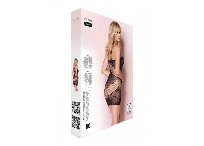 Смілива сітчаста чорна міні-сукня на одне плече з контрастним малюнком Casmir CA001, завдяки спірально розташованому квітковому візерунку з вертикальними вирізами, підкреслить жіночність вашої фігури. Викликаюча, завдяки прозорому матеріалу, сукня демонструє всю красу ваших апетитних форм, з акцентом на груди та стегна. Додайте до сукні цікаві аксесуари – панчохи, туфлі на високих підборах – і ви отримаєте сексуальне вбрання для романтичного вечора.
