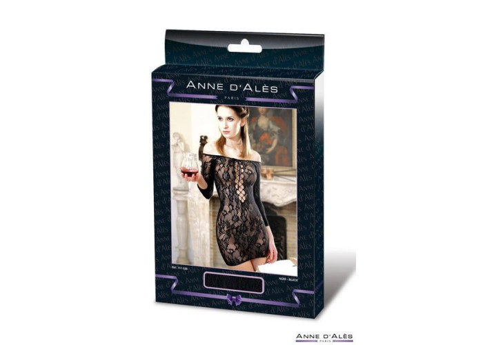 Відверта сукня Fetish Dinner з колекції еротичної білизни та аксесуарів французького бренду Anne De Ales. Вона виконана з еластичного мереживного матеріалу з квітковим візерунком. Сукня чудово облягає тіло, підкреслюючи всі його збуджуючі форми і прикрашаючи ніжним малюнком. Глибоке декольте продовжує смужка сітки крупного плетіння. Відкриті плечі роблять образ більш жіночним і витонченим.