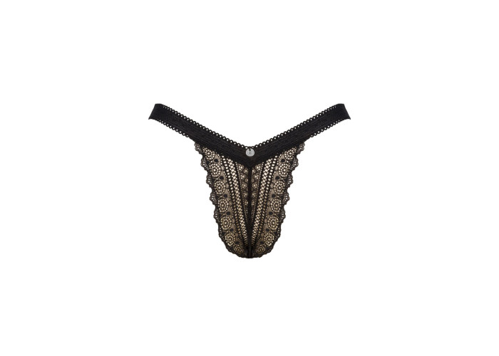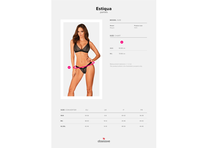 Мереживні трусики із заниженою талією Obsessive Estiqua panties виконані з м’якого матеріалу з мереживним малюнком. Еластична, приємна до тіла резинка трусиків не передавлює і не натирає ніжну шкіру. Трусики скроєні та пошиті таким чином, щоб підкреслити всі спокусливі вигини та заворожити недомовленістю. Стрункі ніжки і прикриті сідниці, приваблива і приваблива западинка пупка — ці трусики створені, щоб спокушати і дражнити, спалахувати і спопеляти в важкій еротичній грі. Прикраса на трусиках у вигляді медальйончика з фірмовим логотипом — як натяк на шлях до головного коштовності цього вечора.