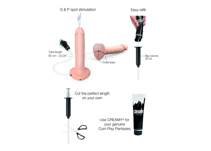 Для максимально реалістичних відчуттів у комплекті ви знайдете спеціальний «шприц» об’ємом 30 мл, з’єднаний із фалоімітатором спеціальною гнучкою трубочкою. Довжина трубочки 82 см, вона легко виймається, тому за потреби можете її вкоротити. В основі фалоімітатора є 3 виїмки для зручної фіксації. У бажаний момент достатньо вичавити «шприц» до упору, щоб відчути потужний струмінь, що вистрілює з фалоса. Для максимального ефекту як еякулят ідеально підійде змазка Creamy (продається окремо), вона схожа на сперму і зовні, і за консистенцією.