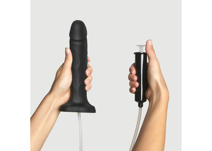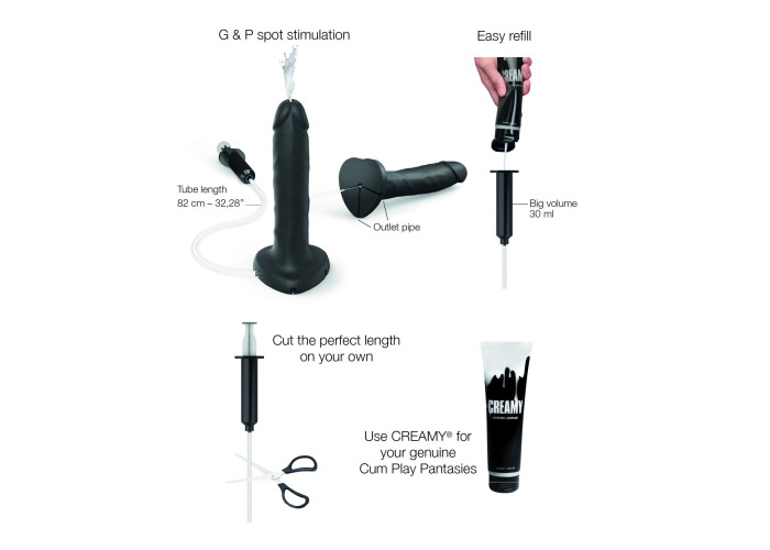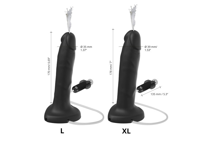 Для максимально реалістичних відчуттів у комплекті ви знайдете спеціальний «шприц» об’ємом 30 мл, з’єднаний із фалоімітатором спеціальною гнучкою трубочкою. Довжина трубочки 82 см, вона легко виймається, тому за потреби можете її вкоротити. В основі фалоімітатора є 3 виїмки для зручної фіксації. У бажаний момент достатньо вичавити «шприц» до упору, щоб відчути потужний струмінь, що вистрілює з фалоса. Для максимального ефекту як еякулят ідеально підійде змазка Creamy (продається окремо), вона схожа на сперму і зовні, і за консистенцією.