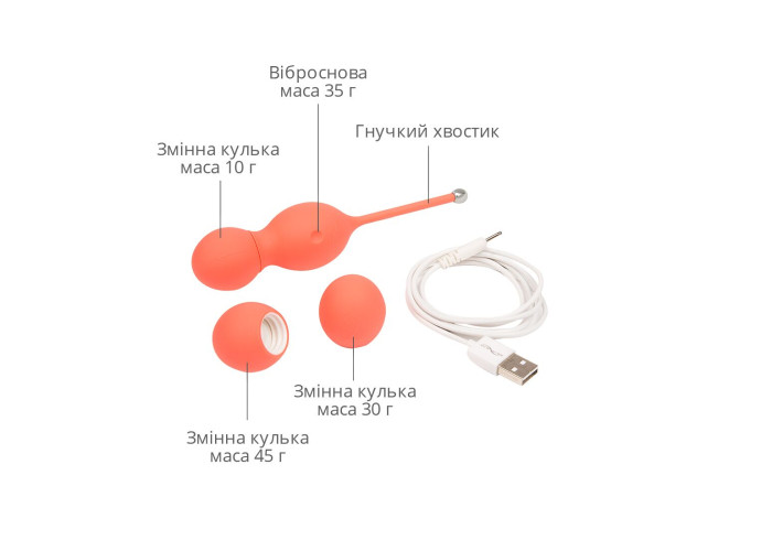 У пакованні: вагінальні смарт-кульки з насадками, зарядний кабель, інструкція, мішечок для зберігання, пробник водного лубриканта We-Vibe Lube від pjur.